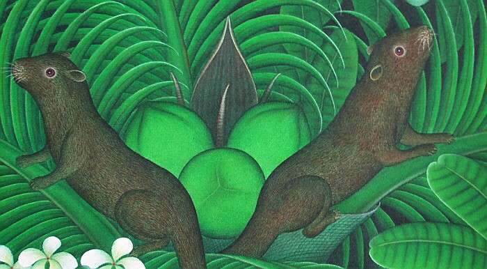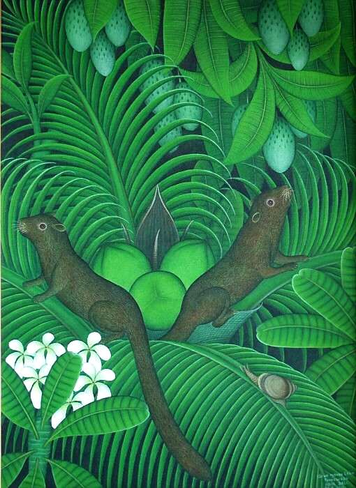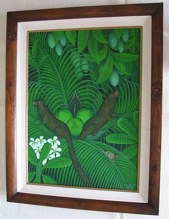 静寂と気品に溢れたLABA氏の作品には、熱帯の森や村に生息する万物の聖霊の存在を強く感じます。気になる絵が見つかると、初めに全体の印象を確認し、その後背景を調べ、合格となったら中央のモチーフを凝視し、最後に人物(動物)の場合は瞳に集まると云われます。さて、こちらの作品は如何でしたでしょうか?澄んだ瞳に吸い込まれないようご注意下ください!