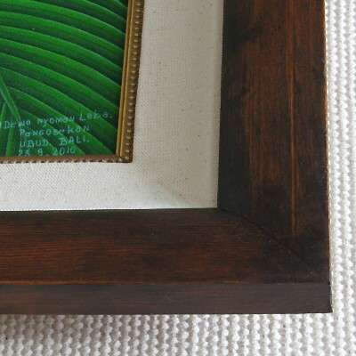 この作品は重厚で木目の美しい無垢のニャント材額縁(麻マット付)に入れてお届けします。フレーム(額縁)やアクリルボードに付いての説明はこちらを参照ください。