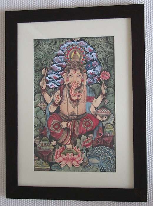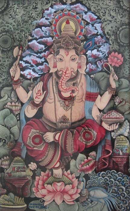 緻密な描写が命の細密画は、伝統バリ絵画の屋台骨といっても過言ではないほどの重要な技術で、ウブド郊外のクリキ村がその本場です。学問の神様ガネーシャ神が美しい色彩感で描かれています。