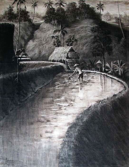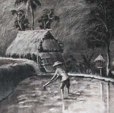 モノトーンの写真のような山間の農村の風景画ですね。布にコンテで描かれ、その上を定着剤でコーティングしてあります。