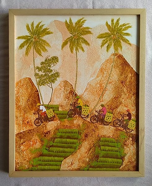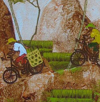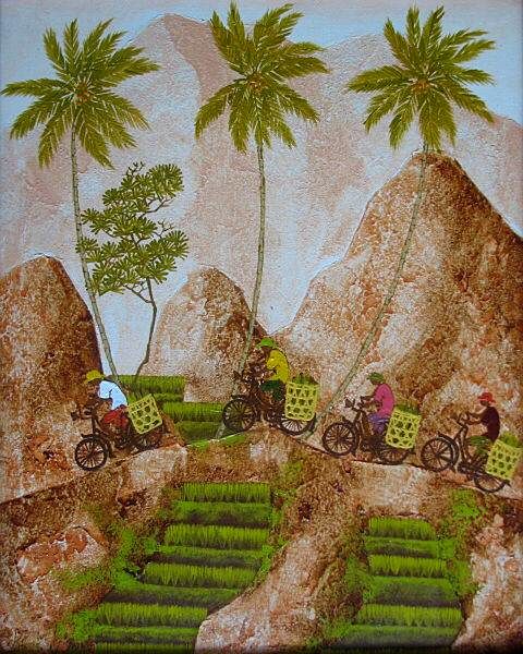 TISNA氏の「緑の峠シリーズ」の中の一点で、セレモニーに向かう村人の行列を描いています。バリ島の村々では週に一度大事な祭礼があり、次々とやって来る神様の祭礼の準備で頭が一杯で、お供え物でお財布の中は空っぽという話しをよく聞きます。