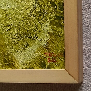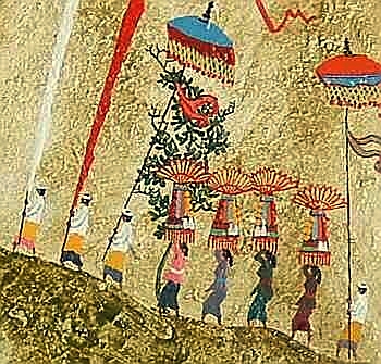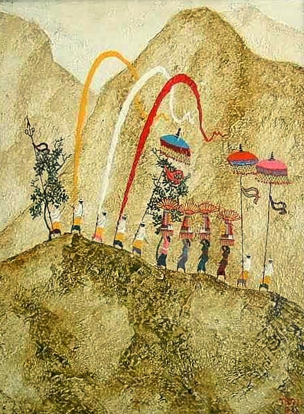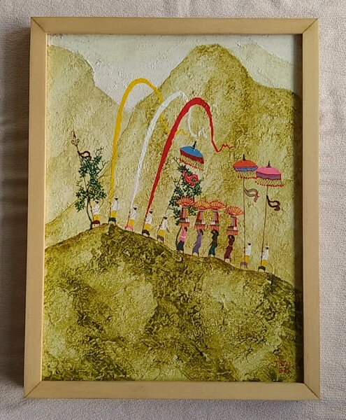 TISNA氏の「緑の峠シリーズ」の中の一点で、セレモニーに向かう村人の行列を描いています。バリ島の村々では週に一度大事な祭礼があり、次々とやって来る神様の祭礼の準備で頭が一杯で、お供え物でお財布の中は空っぽという話しをよく聞きます。