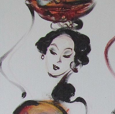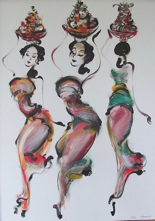 真っ白なキャンバスに、流れるような筆使いでボディラインを一気に描き出し、鮮やかな彩色で衣装を重ねて行く。魔法のような筆さばきで、次々と美しい女たちがこの世に送り出されて行く光景には、背筋がゾクゾクするほどの興奮を覚えました。鋭い眼光のKetut氏は、その後さっさと釣りに出かけたのでしたが、無論、迷わず購入させていただきました。