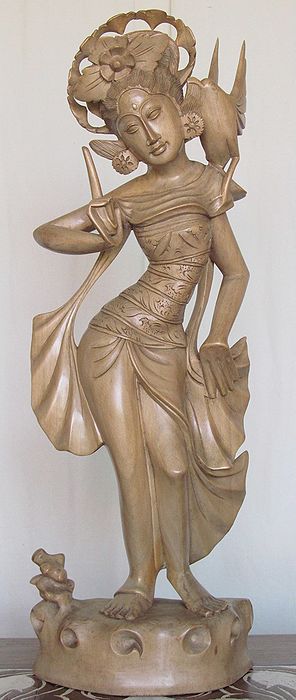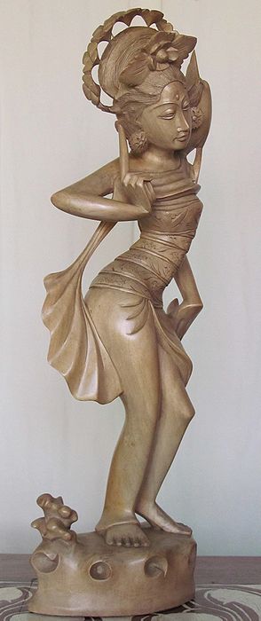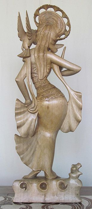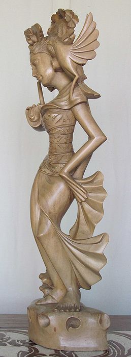 穏やかな表情と美しい容姿の木彫像で、羽衣を纏っていますので日本では「天女」にあたる女神様かと思われます。指を立てて、肩に止まった野鳥の囀りに耳を傾けているようにみえます。クロコダイルウッドは経年して飴色に変わり、よく乾燥しており、ひび割れや変形の心配はないでしょう。半年に一度は油性ワックスで磨いて乾燥防止と埃を取り払ってくださいね!