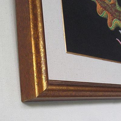 この作品は光沢を抑えた上品な金泥色の木製額縁(麻マット付)に入れてお届けします。