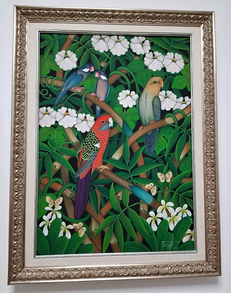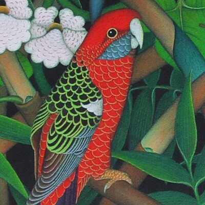 静寂と気品に溢れたLABA氏の作品には、熱帯の森や村に生息する万物の聖霊の存在を強く感じます。気になる絵が見つかると、初めに全体の印象を確認し、その後背景を調べ、合格となったら中央のモチーフを凝視し、最後に人物(動物)の場合は瞳に集まると云われます。