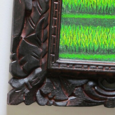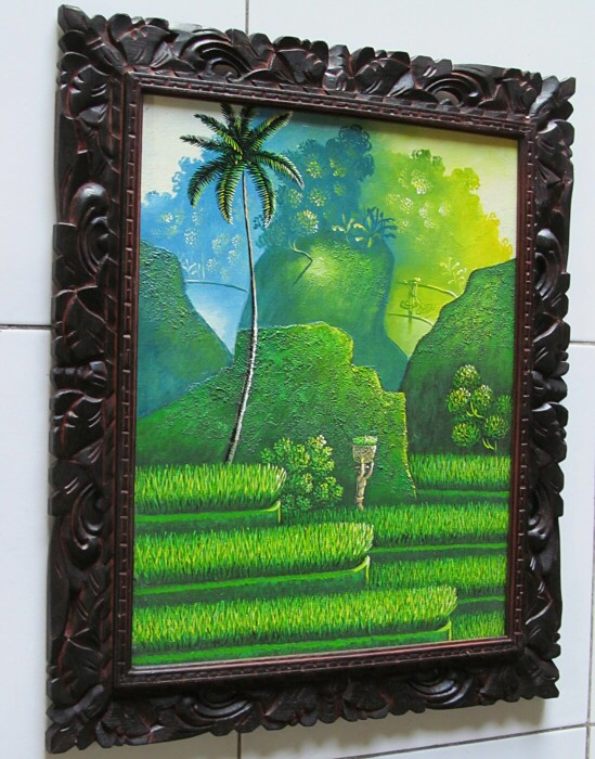 この作品はバリ島の香りいっぱいの木彫額縁(スモーク加工)に入れてお届けします。