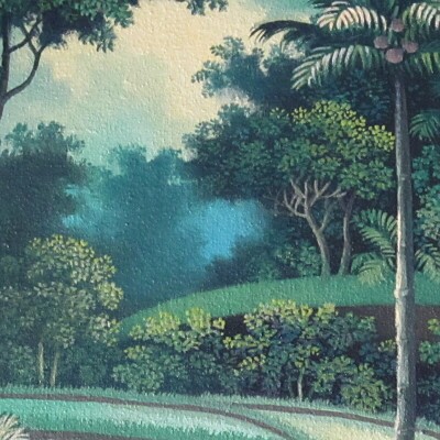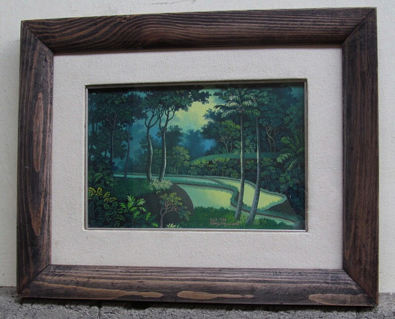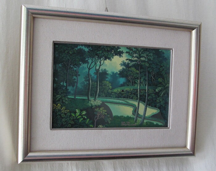 バリ島の山間に広がる棚田風景が幻想的に描かれた作品で、光と影の絶妙なバランスが魅力的です。
