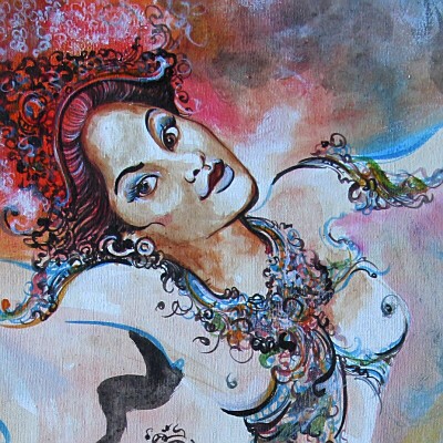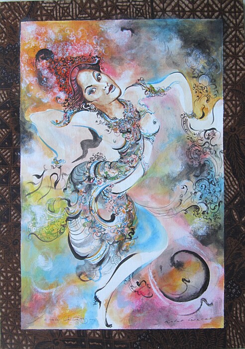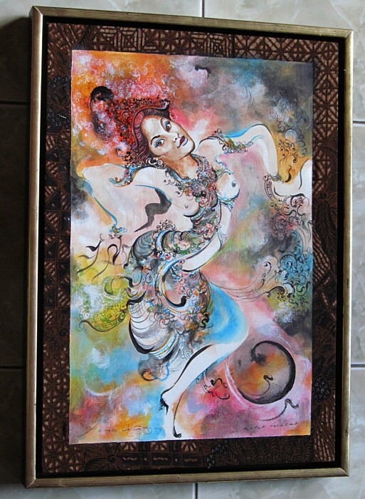 流れるような筆使いでボディラインを一気に描き出し、鮮やかな彩色の衣装が重ねられる、魔法のような筆さばきで、次々と美しい女たちがこの世に送り出されて行く光景には、背筋がゾクゾクするほどの興奮を覚えました。キャンバスは、Weces氏考案のジャワ・バティック(ろうけつ染布地)に白布を貼り付けた布地を採用。