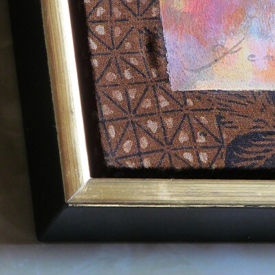 この作品は前面が金色で側面が黒色に塗装された、奥行きのある木製塗額縁に入っています。絵と額縁の間に隙間を入れることにより、中の絵に広がりが出る効果があり、人物の動きも伸びやかに感じられるのではないでしょうか。前面の塗装部分に禿のような部分がありますが、それがこの額縁のオリジナルですので、お気になさらないでください。