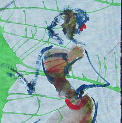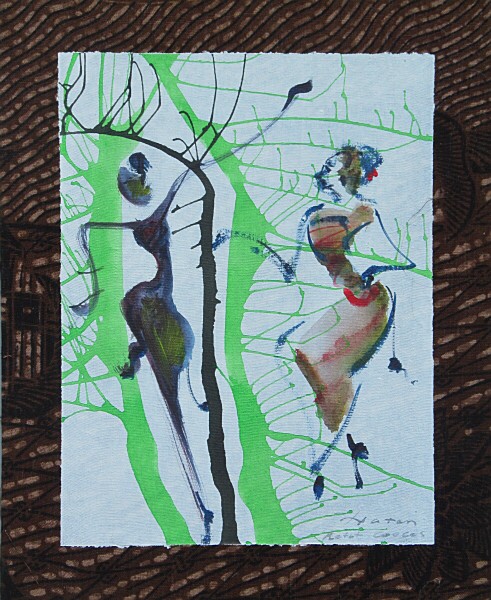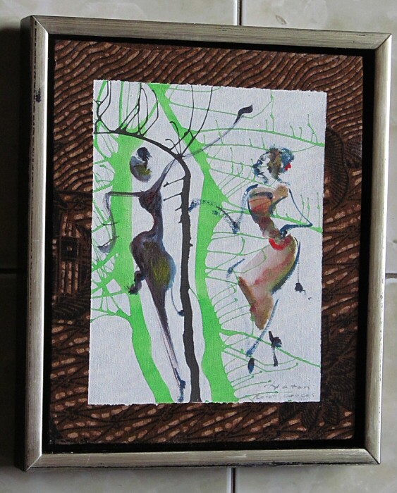 流れるような筆使いでボディラインを一気に描き出し、鮮やかな彩色の衣装が重ねられる、魔法のような筆さばきで、次々と美しい女たちがこの世に送り出されて行く光景には、背筋がゾクゾクするほどの興奮を覚えました。キャンバスは、Weces氏考案のジャワ・バティック(ろうけつ染布地)に白布を貼り付けた布地を採用。