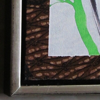 この作品は前面が銀色で側面が黒色に塗装された、奥行きのある木製塗額縁に入っています。絵と額縁の間に隙間を入れることにより、中の絵に広がりが出る効果があり、人物の動きも伸びやかに感じられるのではないでしょうか。前面の塗装部分に禿のような部分がありますが、それがこの額縁のオリジナルですので、お気になさらないでください。