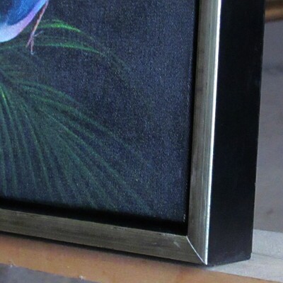 この作品は前面が銀色で側面が黒色に塗装された、奥行きのある木製塗額縁に入っています。絵と額縁の間に隙間を入れることにより、中の絵に広がりが出る効果があります。前面の塗装部分に禿のような部分がありますが、それがこの額縁のオリジナルですので、お気になさらないでください。