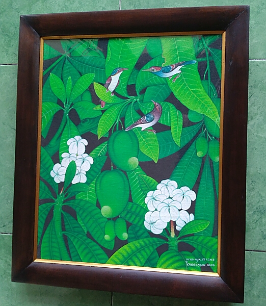 この作品はバリ島の香りいっぱいの無垢の木製額縁に入れてお届けします。フレーム(額縁)やアクリルボードに付いての説明はこちらを参照ください。→ バリ島のフレームに付いて