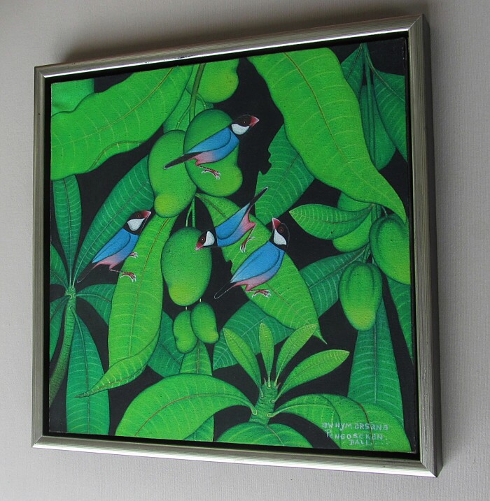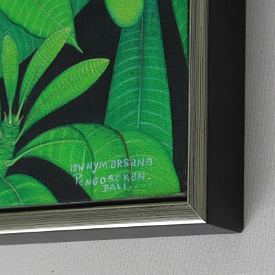 この作品は前面が銀色で側面が黒色に塗装された、奥行きのある木製塗額縁に入っています。絵と額縁の間に隙間を入れることにより、中の絵に広がりが出る効果があります。前面の塗装部分に禿のような部分がありますが、それがこの額縁のオリジナルですので、お気になさらないでください。