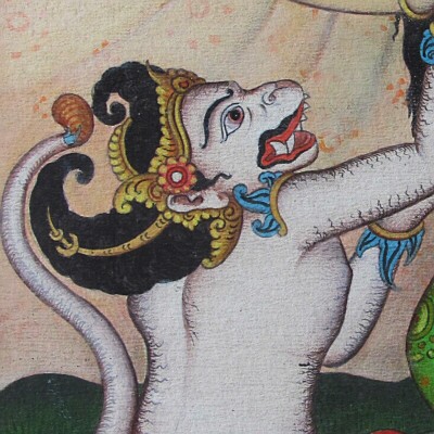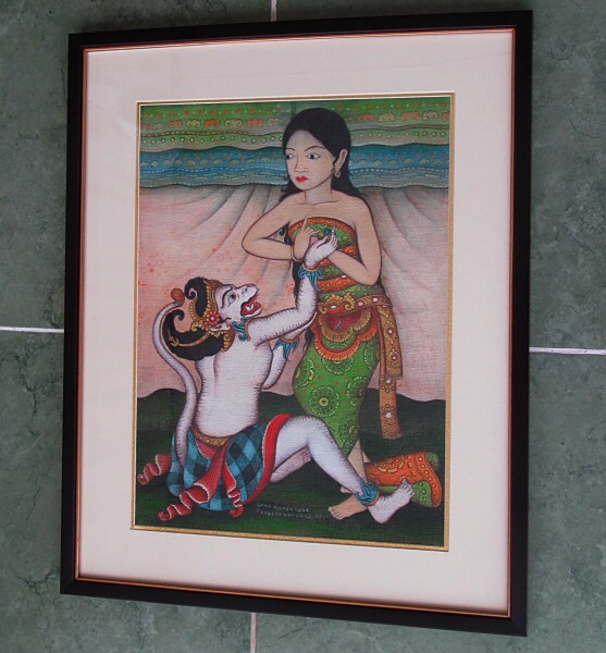 90年代のLABA氏の作品で、ヒンドウー神話が描かれた珍しい作品です。「叙事詩ラーマヤナ」の一場面で、魔王ラーヴァナの王宮に忍び込んだハヌマンが、囚われていたシータ姫を見つけ出し、ラーマ王子から預かってきた指輪を渡してシータ姫を元気付けている場面のようです。