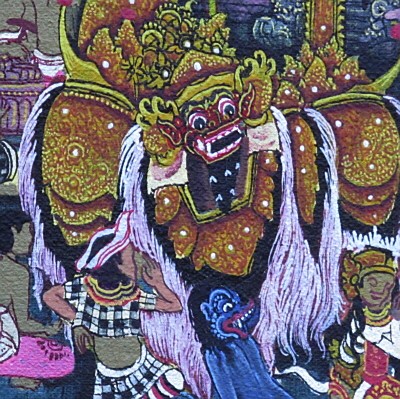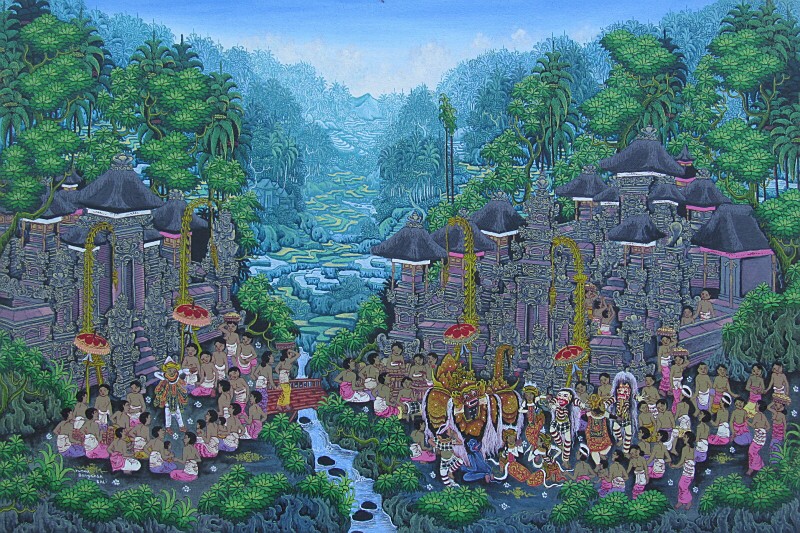 バリ島の美しい田園風景の中に、古代遺跡を思わせる荘厳な寺院が建ち、村人たちが奉納芸を演じている場面でしょうか。演目は左がバリス(戦士)の踊りで、右がチャロナラン劇のようです。