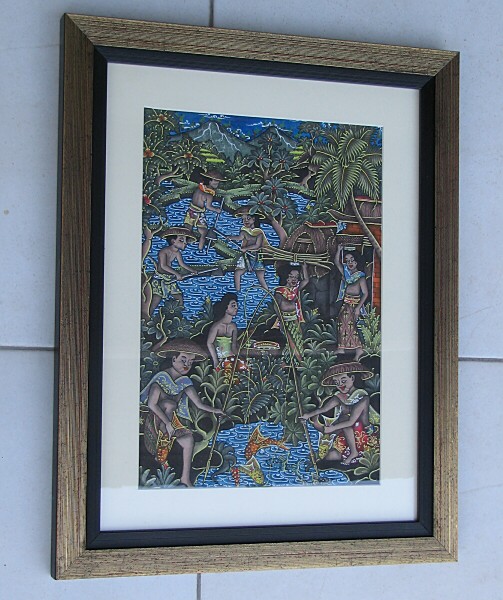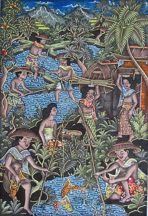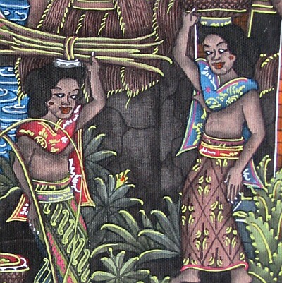 この作品はバトウアン・スタイルの伝統を踏みながら、多彩な色彩を駆使し遠近法を取り入れた近代絵画の技法用いて描かれています。バリ島の豊かな自然を背景に、農村の生活風景が描かれた作品です。