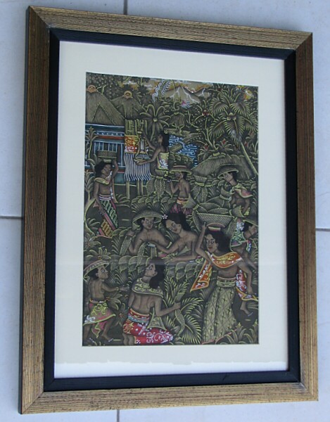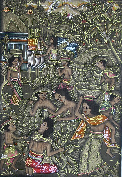 この作品はバトウアン・スタイルの伝統を踏みながら、多彩な色彩を駆使し遠近法を取り入れた近代絵画の技法用いて描かれています。バリ島の豊かな自然を背景に、楽しそうな稲刈りの風景が描かれた作品です。