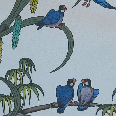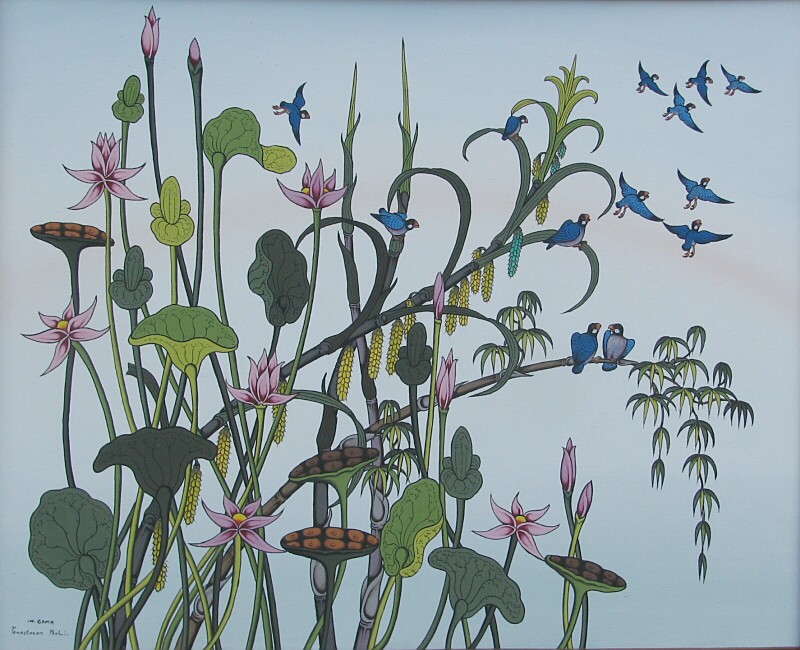 意思を持って奔放に伸び、曲がる植物の枝葉。豊かな表情の生命感にあふれた鳥獣たちの振る舞い。オリジナリティに溢れたGAMA氏の鳥獣戯画は、他のギャラリーで似た絵を見たことがありません。写真から絵の構想をする友人の画家たちと違い、自分はイマジネーションを膨らませ、気分がのった時に製作するという。
