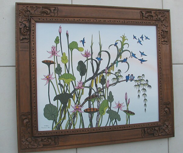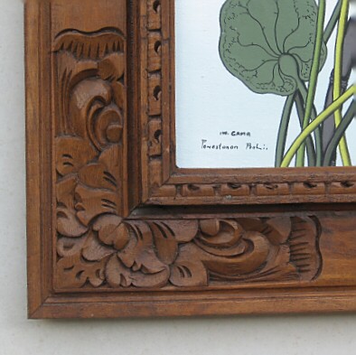 この作品はバリ島の香り漂う彫刻の入った木製額縁に入れてお届けします。