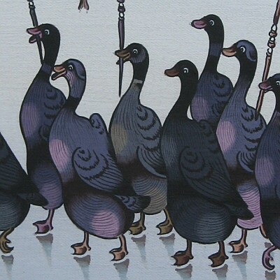 意思を持って奔放に伸び、曲がる植物の枝葉。豊かな表情の生命感にあふれた鳥獣たちの振る舞い。オリジナリティに溢れたGAMA氏の鳥獣戯画は、他のギャラリーで似た絵を見たことがありません。写真から絵の構想をする友人の画家たちと違い、自分はイマジネーションを膨らませ、気分がのった時に製作するという。