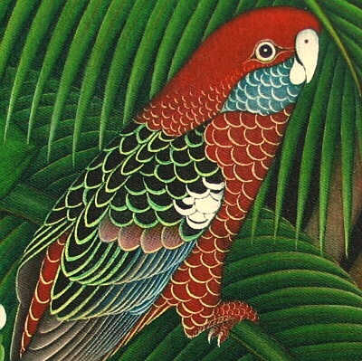 静寂と気品に溢れたLABA氏の作品には、熱帯の森や村に生息する万物の聖霊の存在を強く感じます。気になる絵が見つかると、初めに全体の印象を確認し、その後背景を調べ、合格となったら中央のモチーフを凝視し、最後に人物(動物)の場合は瞳に集まると云われます。