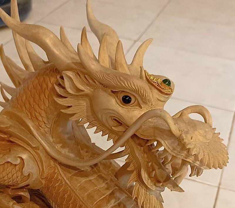 純白の木肌が美しいクロコダイルウッドに彫りだされた龍神で、緻密で精巧な職人技が光る逸品です!。透明ニスで仕上げ塗りが施されています。