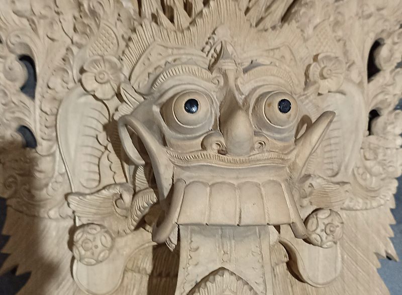 バリ島の奉納劇チャロナランに登場する魔女ランダは聖獣バロンと共に村祭りには欠かせない神様で、村々の神社に奉納されています。無垢のクロコダイル材に掘り出したばかりで、表面に磨きをかけていない段階の作品です。この後、透明のワックスを塗り艶を出して仕上げます。壁掛装飾品としてお楽しみいただけます。