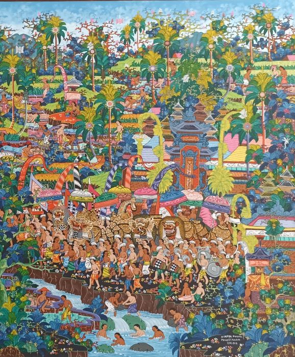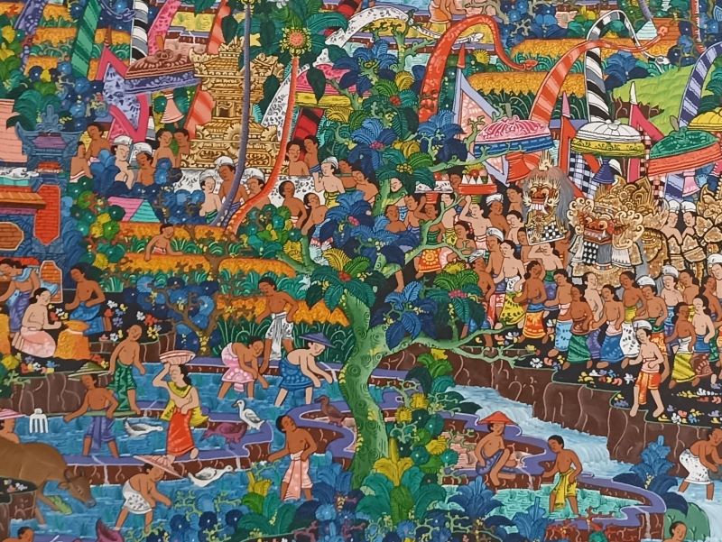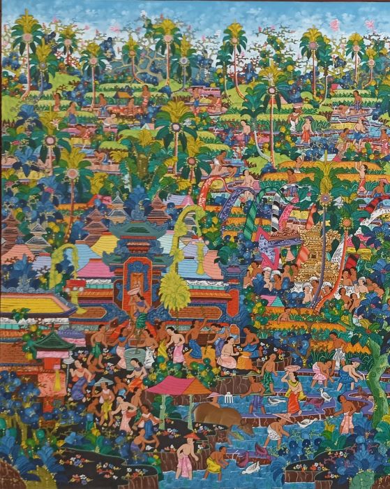熱帯の島バリ島はお米が主食で、農村風景は田植えから稲刈りまで同時期に行われることが珍しくありません。雄大なバリ島の自然を背景にのどかな農村の生活が繊細に描かれています。