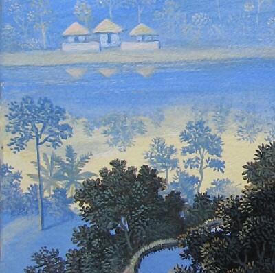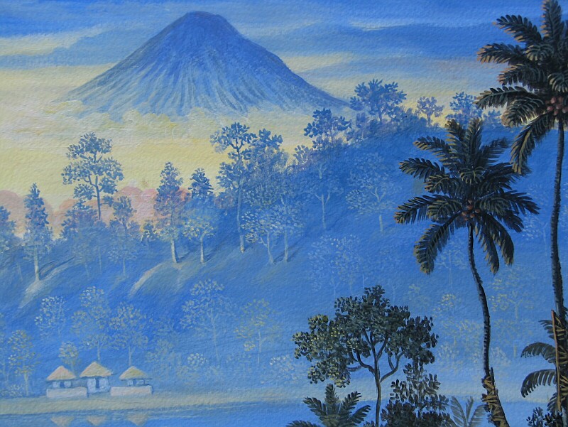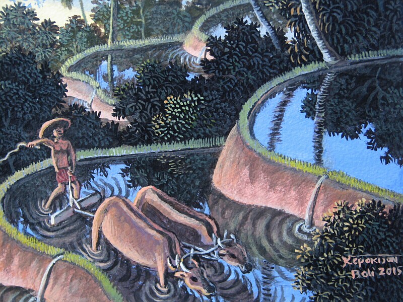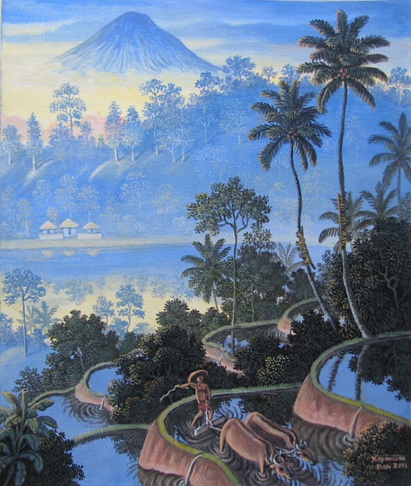 2015年の新作はバリ島の霊峰アグン山を遠景にした雄大な画面構成の作品です。棚田で働く農夫を手前にし中間に湖を配した、青を基調色にした清々しい珠玉の作品ですね!