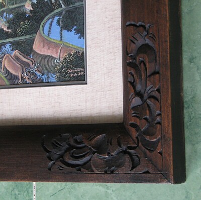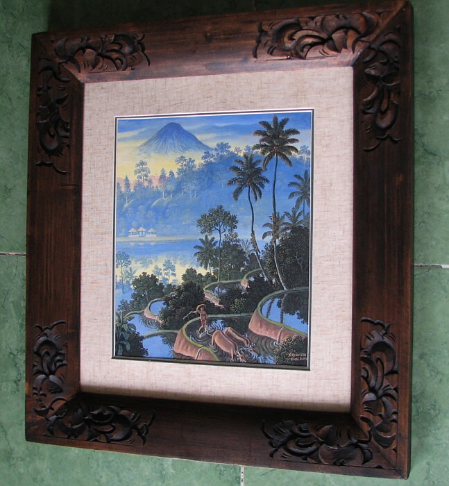 この作品重厚な無垢のニャント材に彫刻を施したバリ島の香りいっぱいの額縁に入れてお届けします。紙に描かれた作品で、麻マット+アクリル板で保護してあります。