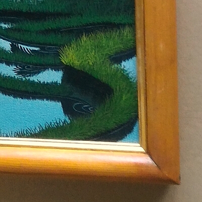この作品は無垢のニャント材木製額縁に入れてお届けします。額縁の内側に面金が付いています。