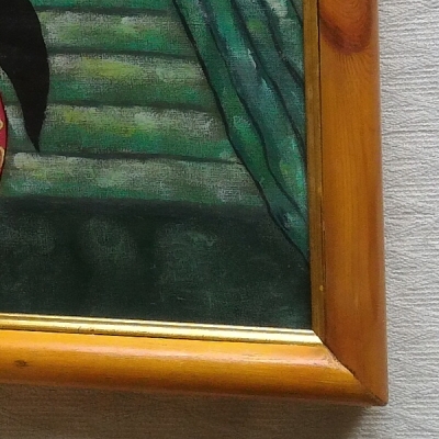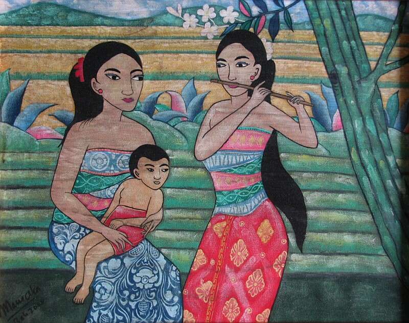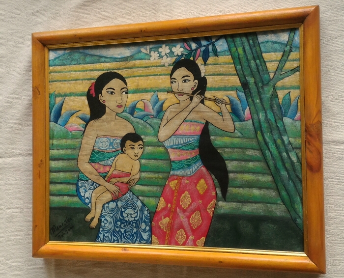 ゆったりとした時間が流れるバリ島の農村風俗を描いた作品で、まるで当店のギャラリーLIPのあるウブド郊外のプネスタナン村の風景のようです…。伝統衣装のバティックを纏った村人たちの憩いのひと時を、美しい