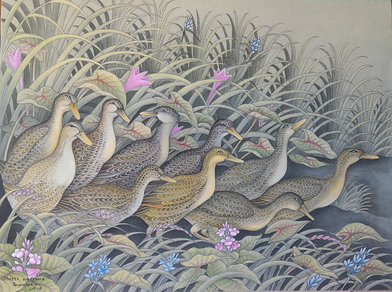 バリ島では稲穂を刈り取った後の水田にカモを放し、落穂や水草昆虫などを求めてカモたちが賑やかに動き回る光景がアチコチで見受けられます。今朝も店主の家の前の水田で同じような光景が繰り返されていますよ!