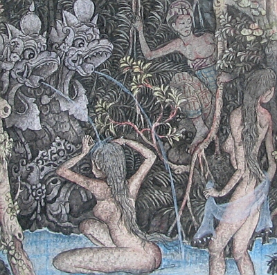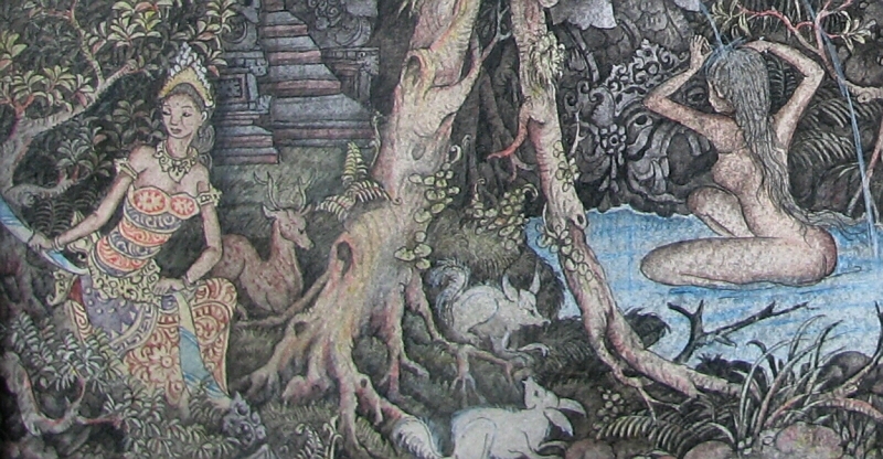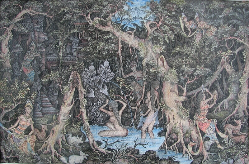 濁りのない美しい配色のグラデーションと、線の一つ一つが巧みな筆使いでくっきりと描写されています。村人たちの日々の生活や祭礼行事などが、美しいバリ島の農村風景を背景にコミカルなタッチで描かれた躍動的で楽しい作品です!羽衣伝説は天上から降りてきた7人の天女が主人公のストーリーですので、その起源は日本に伝承される物語と同じものと思われます。