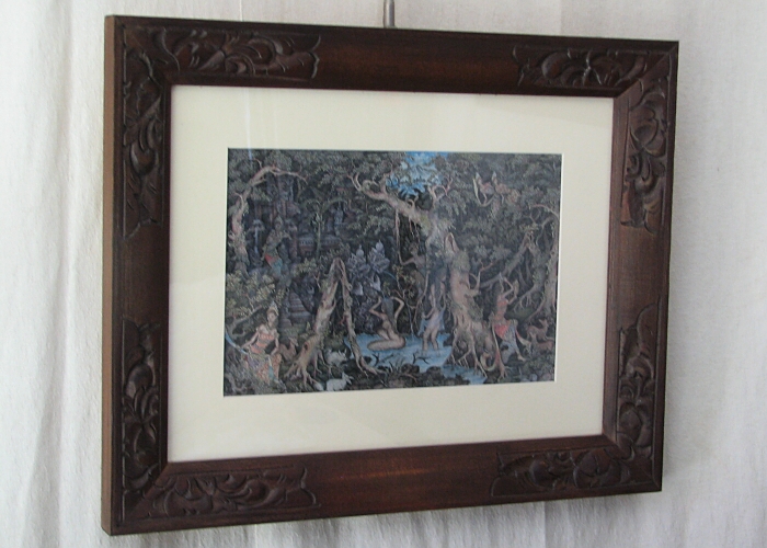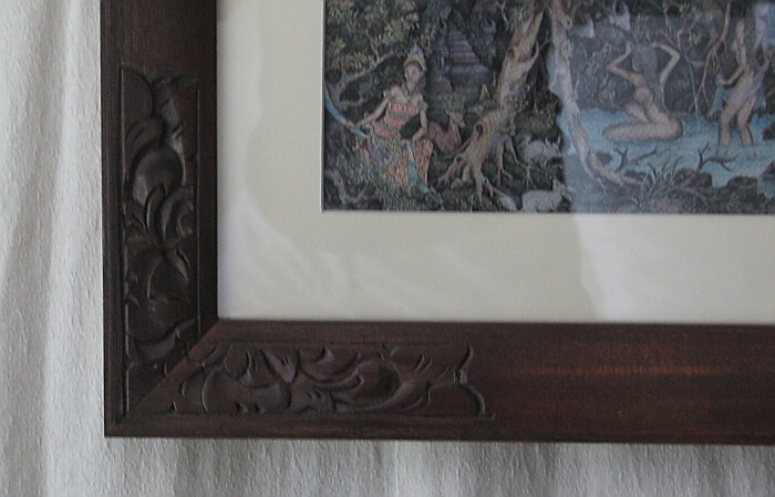 この作品は彫刻入りの重厚で木目の美しい無垢のニャント材額縁に入れてお届けします。額縁の内側に紙マット+アクリル板が付いています。