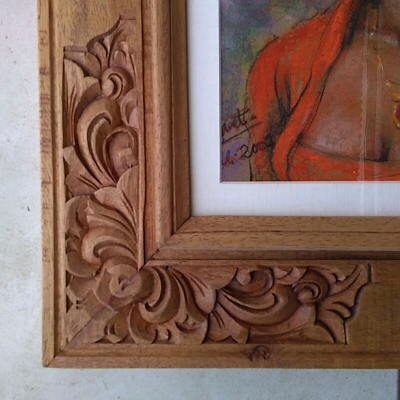 この作品は幅の広い重厚な木彫額縁(紙マット+アクリル板付)に入れてお届けします。フレーム(額縁)やアクリルボードに付いての説明はこちらを参照ください。