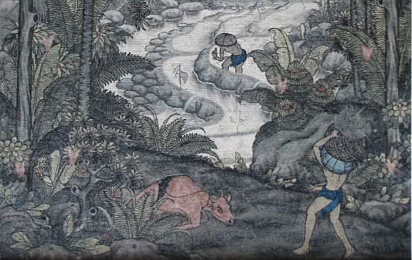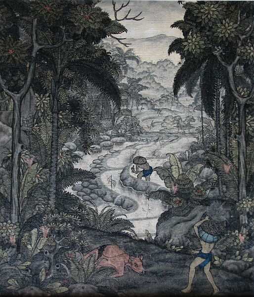 この作品は、キャンバスに刷り込むよう色を重ねていくバリ絵画の伝統的な画法を用いた作品です。