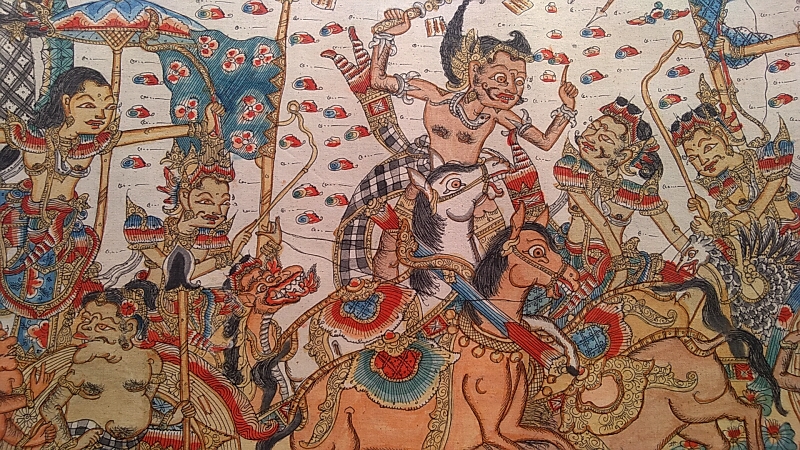 カマサンはバリ島の南東のクルンクンにある村の名前で、その村に伝わる技法がカマサン・スタイルでワヤン・スタイルとも呼ばれるもっとも古い画法です。昔はキャンバスに米の粉を塗りつめ、絵の具にはすす、灰、粘土、植物を使っていました。古代インドの叙事詩「ラーマーヤナ」やバリの民話がテーマになり、人物は影絵のように斜めから描かれているのが特徴です。