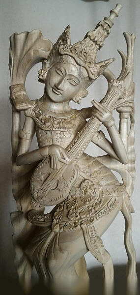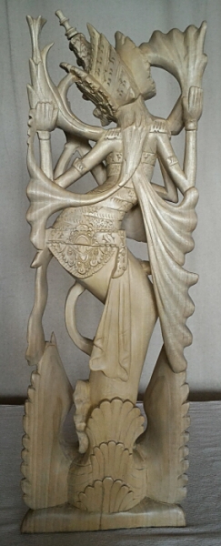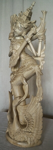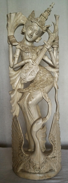 女神サラスワティは学問と芸術の神様として人気があり、純白の木肌のクロコダイルウッドにとても良くお似合いです。キリリとした表情をした見事な出来栄えの木彫像です!