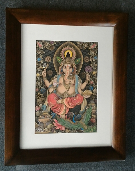 この作品はバリ島の香り溢れる重厚な無垢の木製塗り額縁(紙マット+アクリル板付)に入れてお届けします。 バリ島産の額縁やアクリルボードに付いての説明はこちらを参照ください。