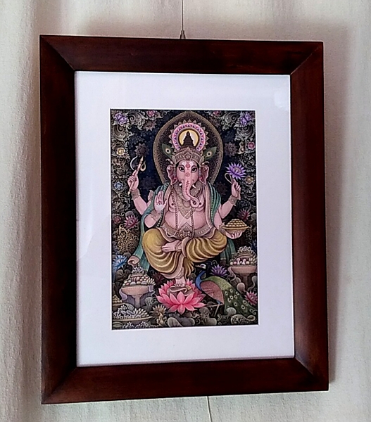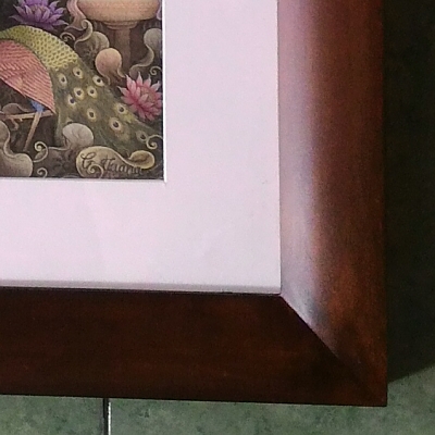 この作品はバリ島の香り溢れる重厚な無垢の木製塗り額縁(紙マット+アクリル板付)に入れてお届けします。 バリ島産の額縁やアクリルボードに付いての説明はこちらを参照ください。