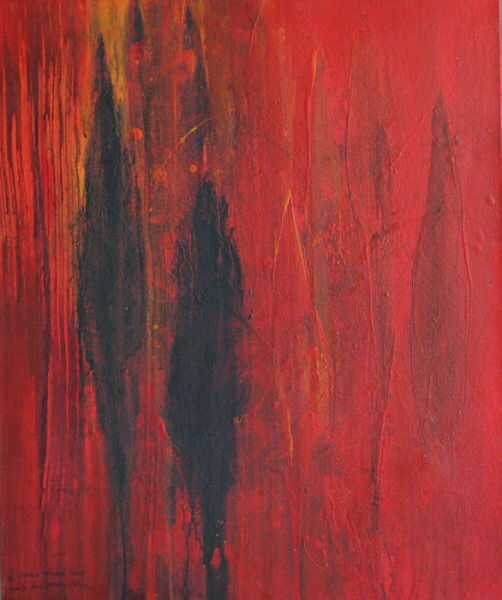 アグンさんのアトリエは野鳥の声が響き渡る谷底のような場所にあり、ここがウブドの中心とは思えないような静けさの中にありました。初めてお引き受けした森をテーマにした連作3点は、氏の内に秘めた信念の強さを感じさせる作品です。
