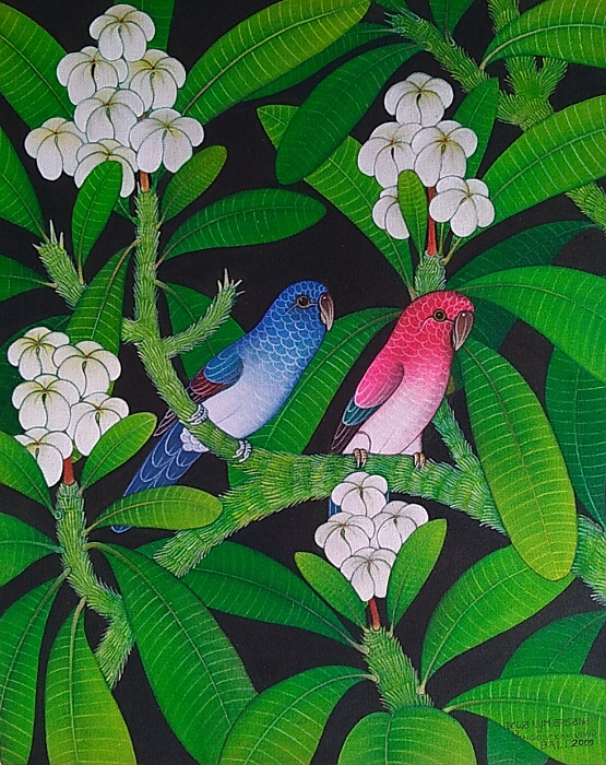 1973年バリ島ウブド地区プンゴセカン村に生まれる。幼いころから父親の画家LABA氏に絵の手ほどきを受ける。1990年Batu Bulanの美術高校を卒業。LABA氏の気品のある優雅な画風の花鳥画の継承者として期待されている画家です。 |