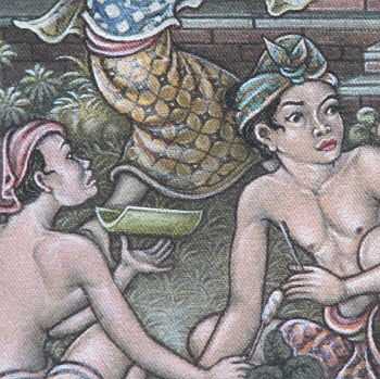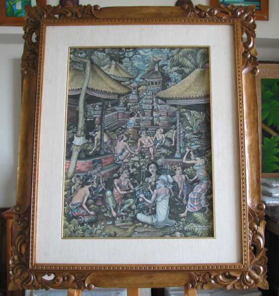 1970年にタマン村に生まれたDAGINGさんはMEJAさんの元で絵を習ったMEJA SCHOOLの優等生で、農村の日々の生活をテーマにした作風に独自のスタイルを確立しています。生き生きとした農村の暮らし振りが表情豊かな村人たちの顔や動作に現れてますね!(BALI BRAVO P.66 に画歴が掲載されています)