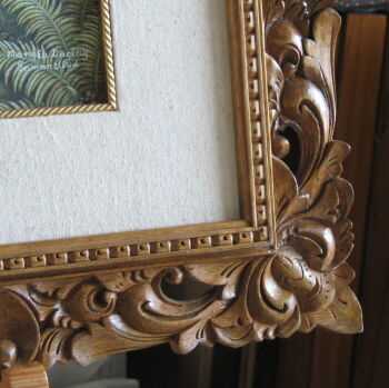 この作品は高級家具材として人気の手彫り入り無垢のチーク材額縁に入れてお届けします。