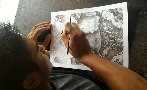 バリ島ウブドプリアタン村在住。1998年首都ジャカルタでのグループ展に参加。プリ・ルキサン美術館でのグループ展に参加。細密画に分類される氏の描くヒンドウの神々は、気品があり生命感に溢れて見るものを魅了してくれる。数少ないバリ島伝統絵画の後継者でもある。 |