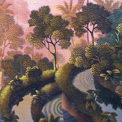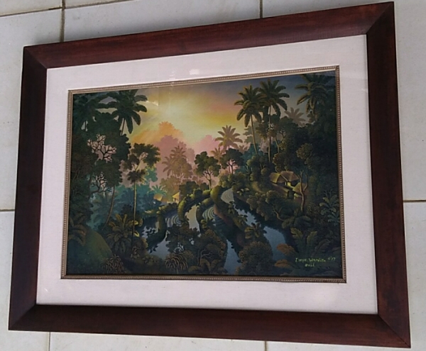 Warditaさんの住むパヤンガン村はキンタマーニ高原の南山麓にあり、当にこの絵のような棚田風景が広がる山間の美しい土地でした。山間の棚田に朝の陽ざしが差し込む一瞬前のひんやりとした静寂な空気が閉じ込められた珠玉の作品です。