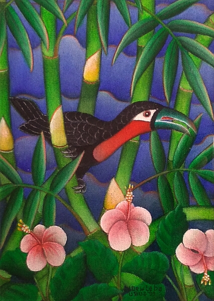 静寂と気品に溢れたLABA氏の作品には、熱帯の森や村に生息する万物の聖霊の存在を強く感じます。気になる絵が見つかると、初めに全体の印象を確認し、その後背景を調べ、合格となったら中央のモチーフを凝視し、最後に人物(動物)の場合は瞳に集まると云われます。